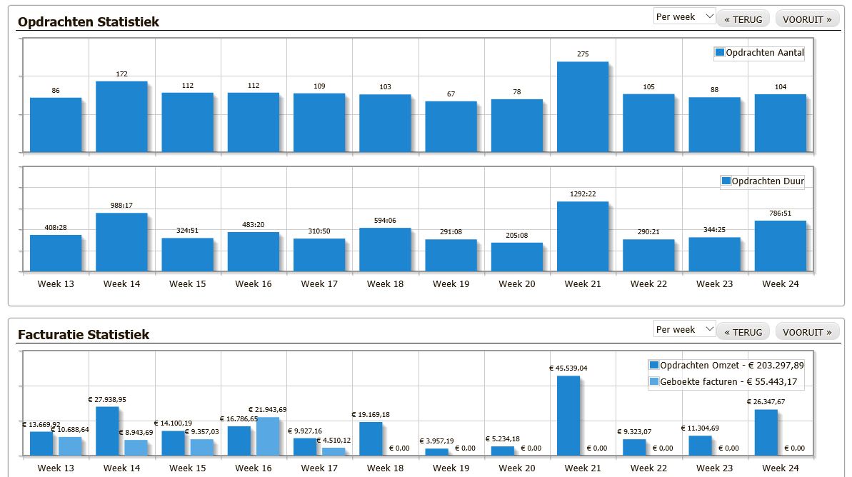 Middels diverse statistieken kan je de actuele ontwikkeling binnen het bedrijf monitoren en deze gegevens indien gewenst gebruiken om de organisatie te sturen.
